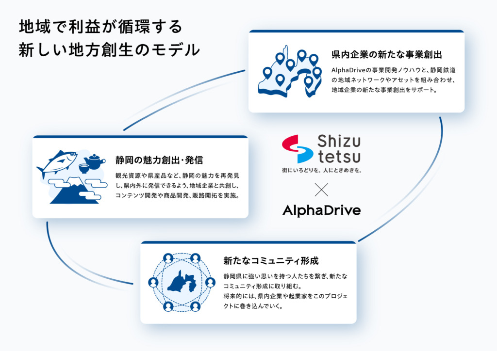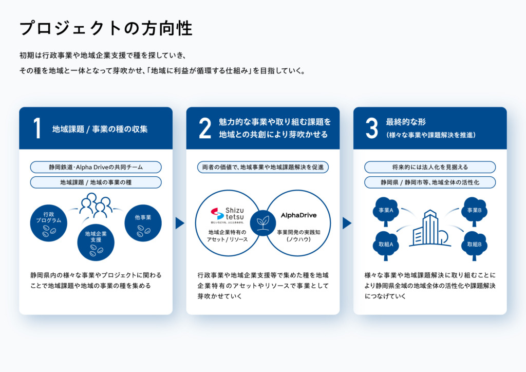 本プロジェクトでは、100年以上の歴史を持ち、静岡県の振興に貢献してきた静岡鉄道と、事業開発のノウハウと地域への強い思いを持つAlphaDriveがタッグを組むことで、地域との共創により、静岡県の活性化と地域課題解決に向けた具体的な事業を立ち上げ実施していくことを目指します。また中長期的には地域の他の企業とも共創しながら、地域の中で循環する取り組みが実現できるようにしていきます。